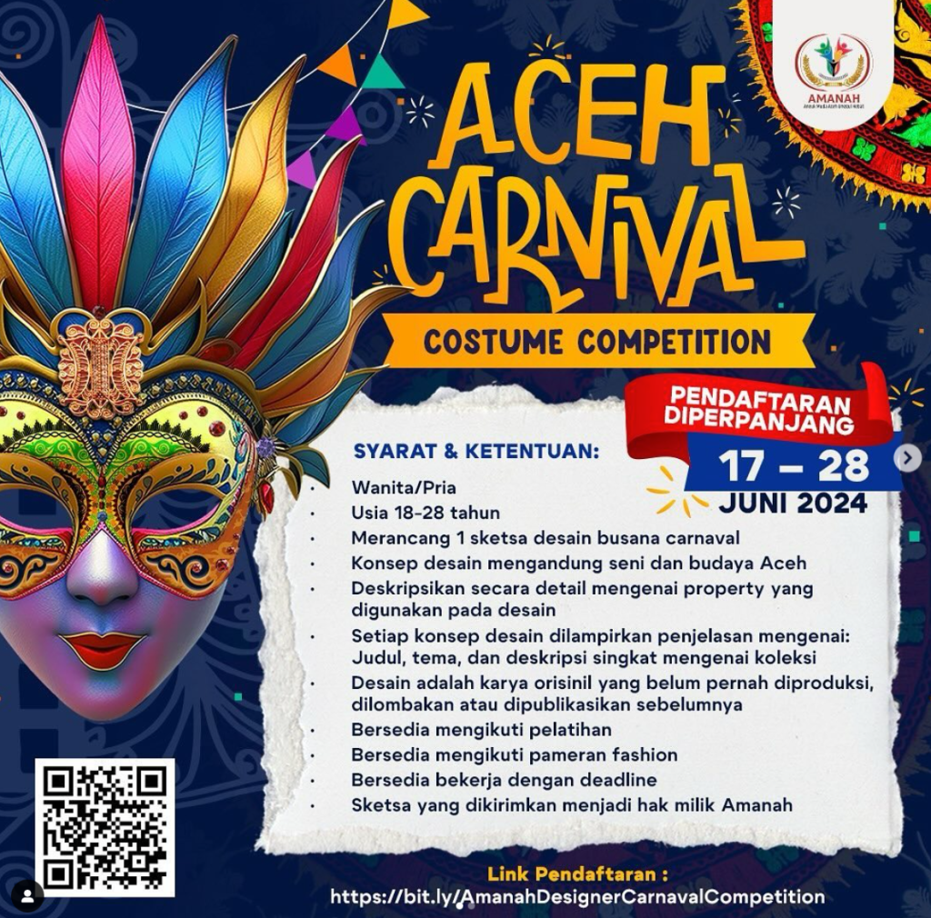 Kegiatan terbaru yang AMANAH laksanakan, yakni membuka pendaftaran Aceh Carnival sejak tanggal 17 hingga 26 Juni 2024 dengan tujuan untuk semakin memperkenalkan, mencintai dan juga sebagai ajang promosi seni dan budaya lokal kepada para generasi muda penerus bangsa.